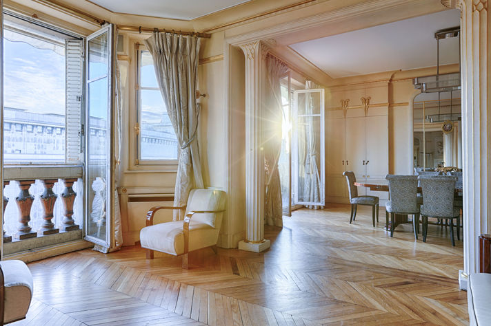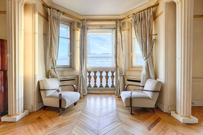 Dès l’entrée, une élégante galerie distribue de vastes espaces de réception. Le salon et la salle à manger, bénéficiant d’une exposition sud-est, sont baignés de lumière naturelle et s’ouvrent sur deux balcons. Depuis les pièces de vie, les vues dégagées sur le Palais de Chaillot et la tour Eiffel offrent un panorama parisien rare, emblématique et intemporel.