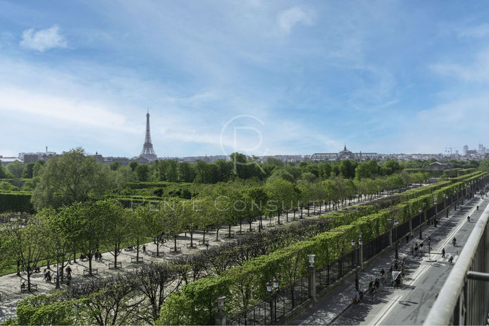 Au cinquième étage d’un immeuble en pierre de taille, un magnifique appartement de 242 m² offrant une vue époustouflante sur le jardin des Tuileries.